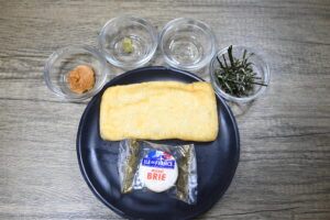 2)フライパンにごま油をひいて、油揚げを焼く。片面が焼けたら裏返す。表面に調味料を塗ってブリーをのせる。皿に盛って上に刻み海苔をのせる。