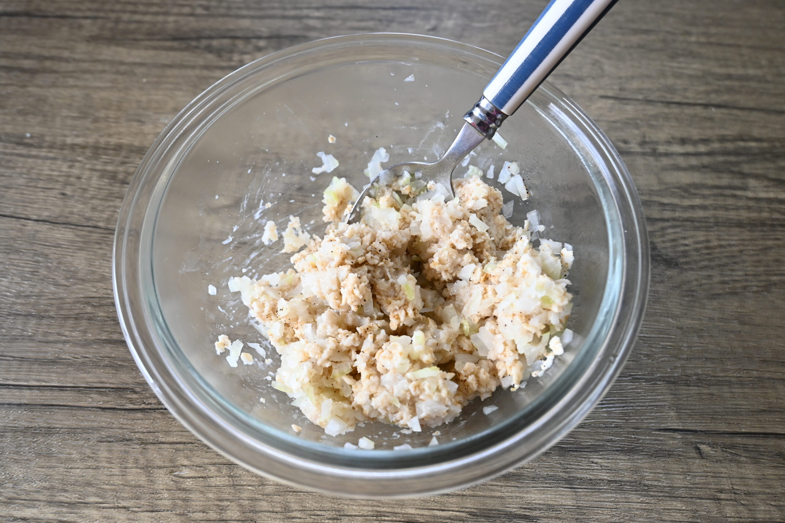 2.ボウルにオートミール、豆腐、醤油、1を入れて、混ぜながらよくこねる。