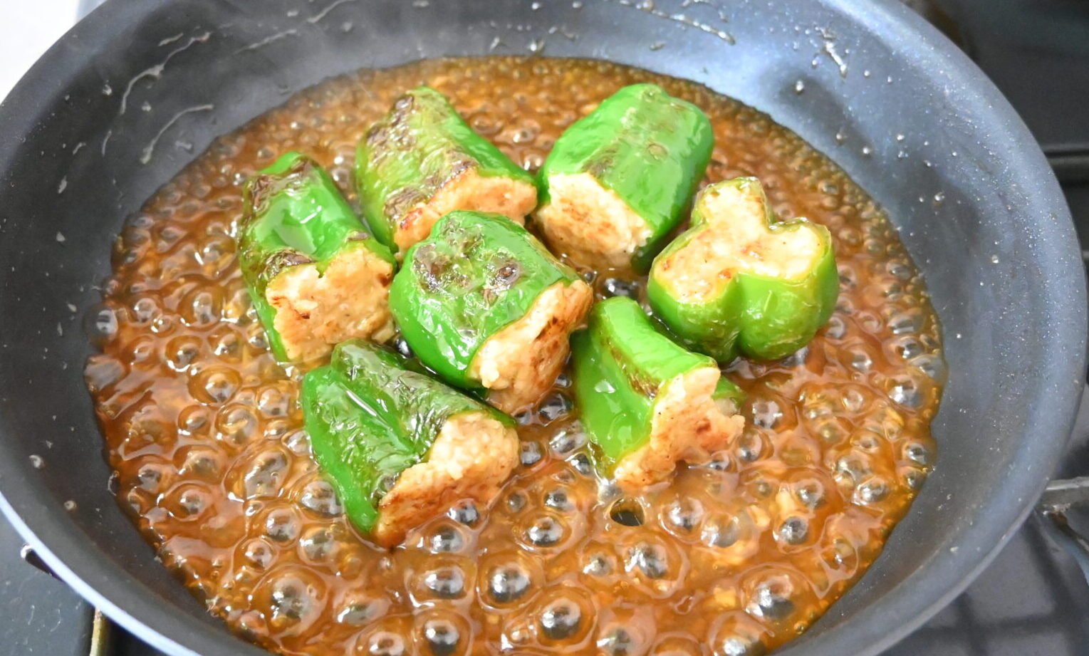 4.フライパンにa)を入れて火にかける。煮立ったら水溶き片栗粉を加えてトロミをつける。3のピーマンをフライパンに戻してタレを絡める。