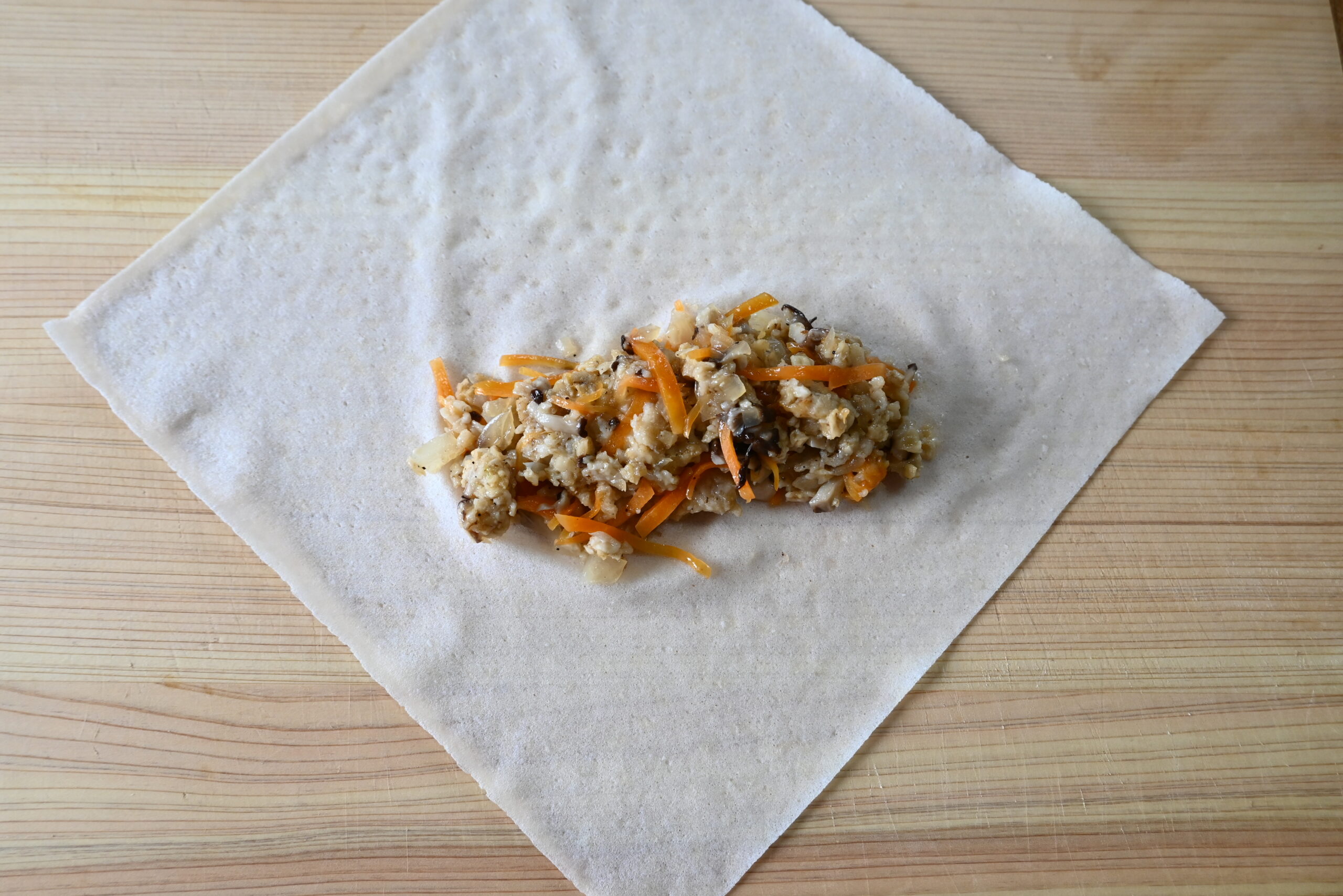 4.3が冷めたら、具材を2分割して春巻きの皮に包む(端に水溶き片栗粉をつけてとめる)。